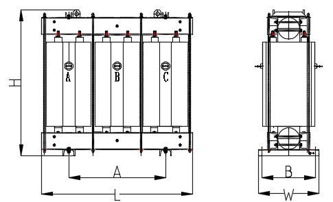 3.電抗器外形尺寸參考標準柜體尺寸設計,體積小、接線方便,可為用戶提供單面或雙面出線的產品。