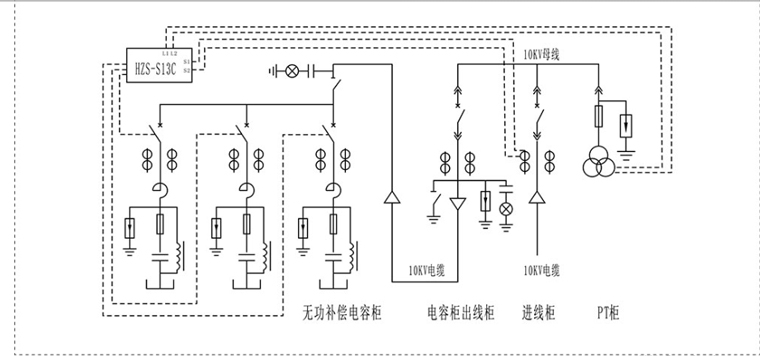 TBBFZ 斷路器投切補(bǔ)償裝置由系統(tǒng)電壓互感器(PT) 采 A、C相電壓信號(hào),系統(tǒng)電流互感器(CT)采集B 相電流信號(hào)傳送到HZS型無(wú)功補(bǔ)償控制器。經(jīng)過(guò)控器采樣電路,得到電壓、電流的模擬信號(hào),再經(jīng) A/D 轉(zhuǎn)換,得出電壓、電流等的數(shù)字量,然后通過(guò)控制器微處理器的運(yùn)算,得出電壓、電流、有功、無(wú)功功率因數(shù)、諧波百分比等參數(shù),與存貯在固定存貯器中的系統(tǒng)設(shè)置點(diǎn)(用戶可根據(jù)以上參數(shù)選擇不同的控制模式。如:根據(jù)無(wú)功+電壓、電壓、電流、功率因數(shù)等)進(jìn)行比較,由系統(tǒng)決定什么情況下操作電容器組,并通過(guò)高壓交流真空接觸器來(lái)執(zhí)行電容器組的分、合閘,從而達(dá)到自動(dòng)循環(huán)投切電容器組,補(bǔ)償線路無(wú)功的目的,使電網(wǎng)上無(wú)功功率供需就地自動(dòng)平衡,起到了降低線損、提高功率因數(shù)及系統(tǒng)的輸電能力、改善配電網(wǎng)供電質(zhì)量等重要的作用。